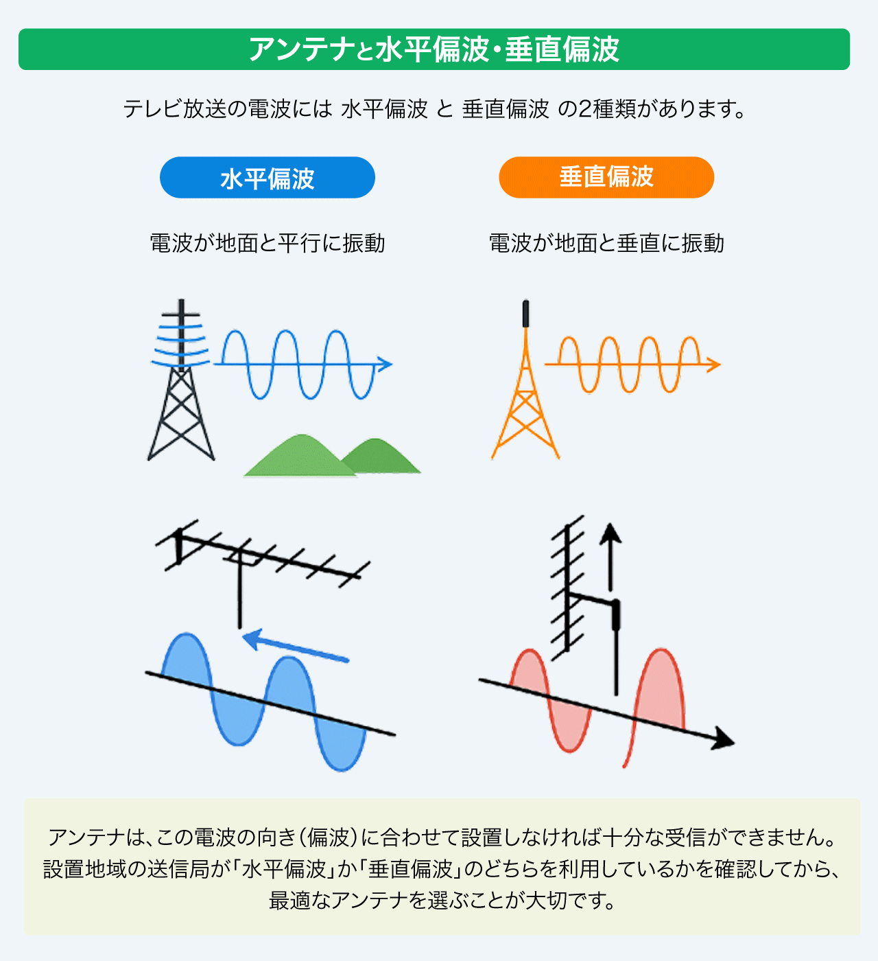 UHF放送(地上デジタル放送)では、混信を防ぐために水平偏波と垂直偏波を使い分けています。